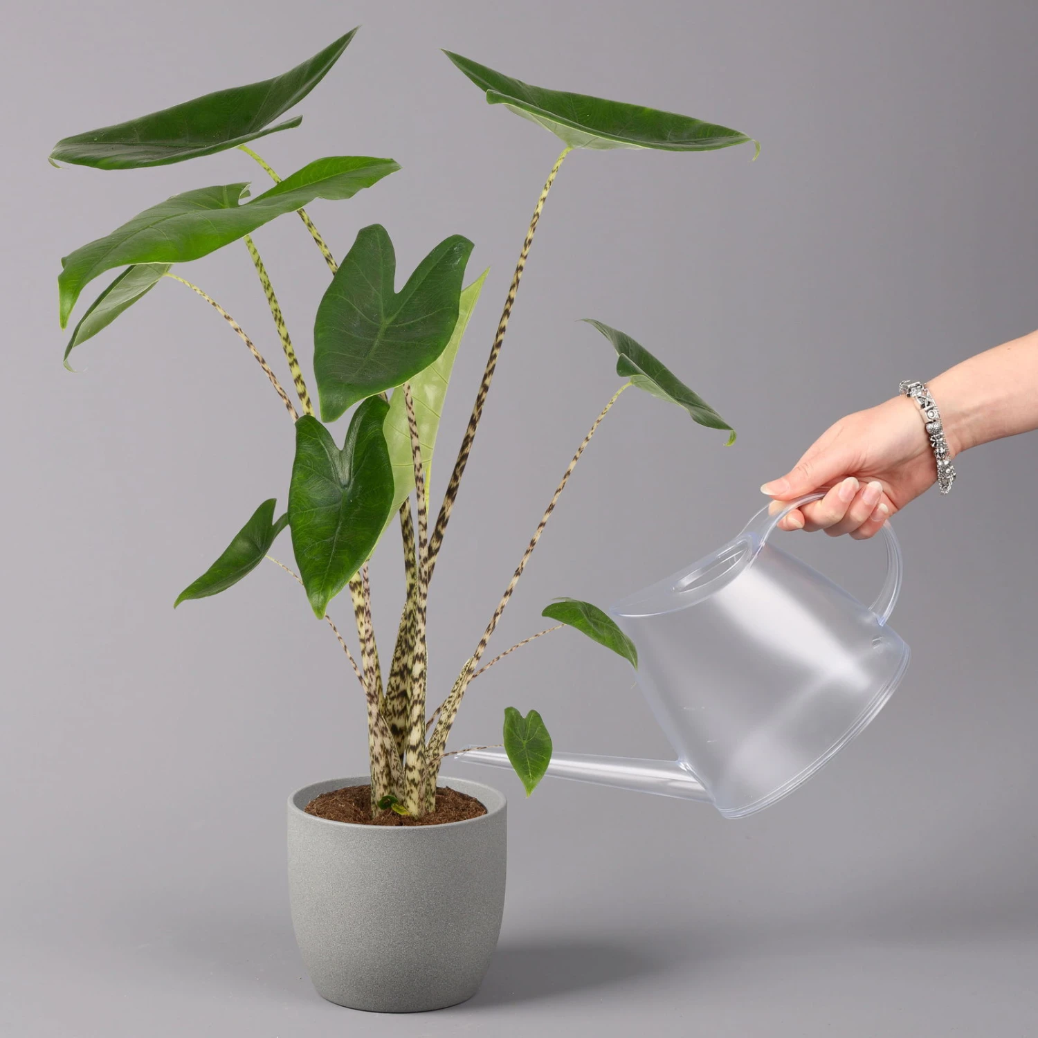 Während der warmen Sommermonate darf die Alokasie gerne an einen halbschattigen, geschützten Standort auf Balkon oder Terrasse umziehen. Achten Sie darauf, die Pflanze schrittweise an die neue Umgebung zu gewöhnen, um Verbrennungen zu vermeiden. Wichtig ist außerdem ein windgeschützter Platz, da die großen Blätter bei starkem Wind schnell Schaden nehmen können.