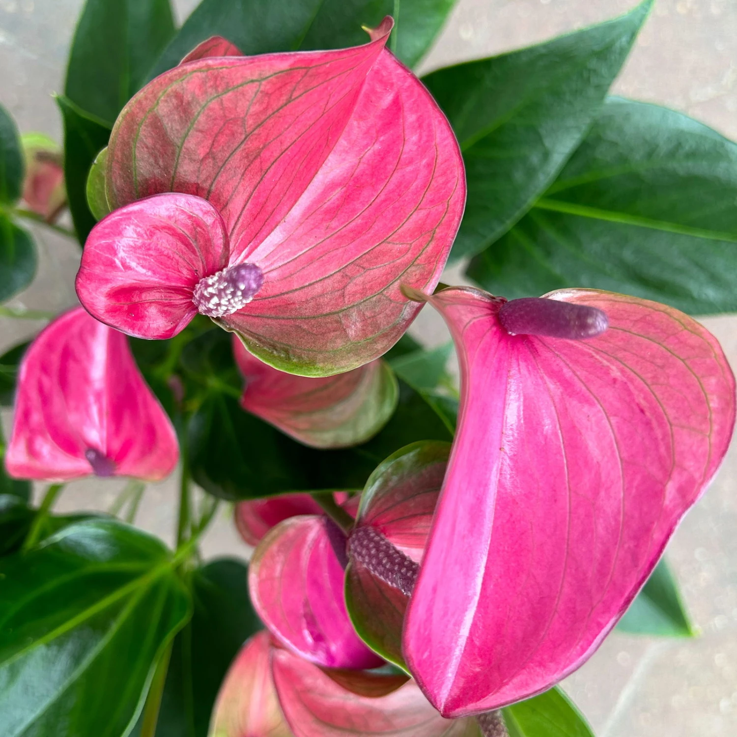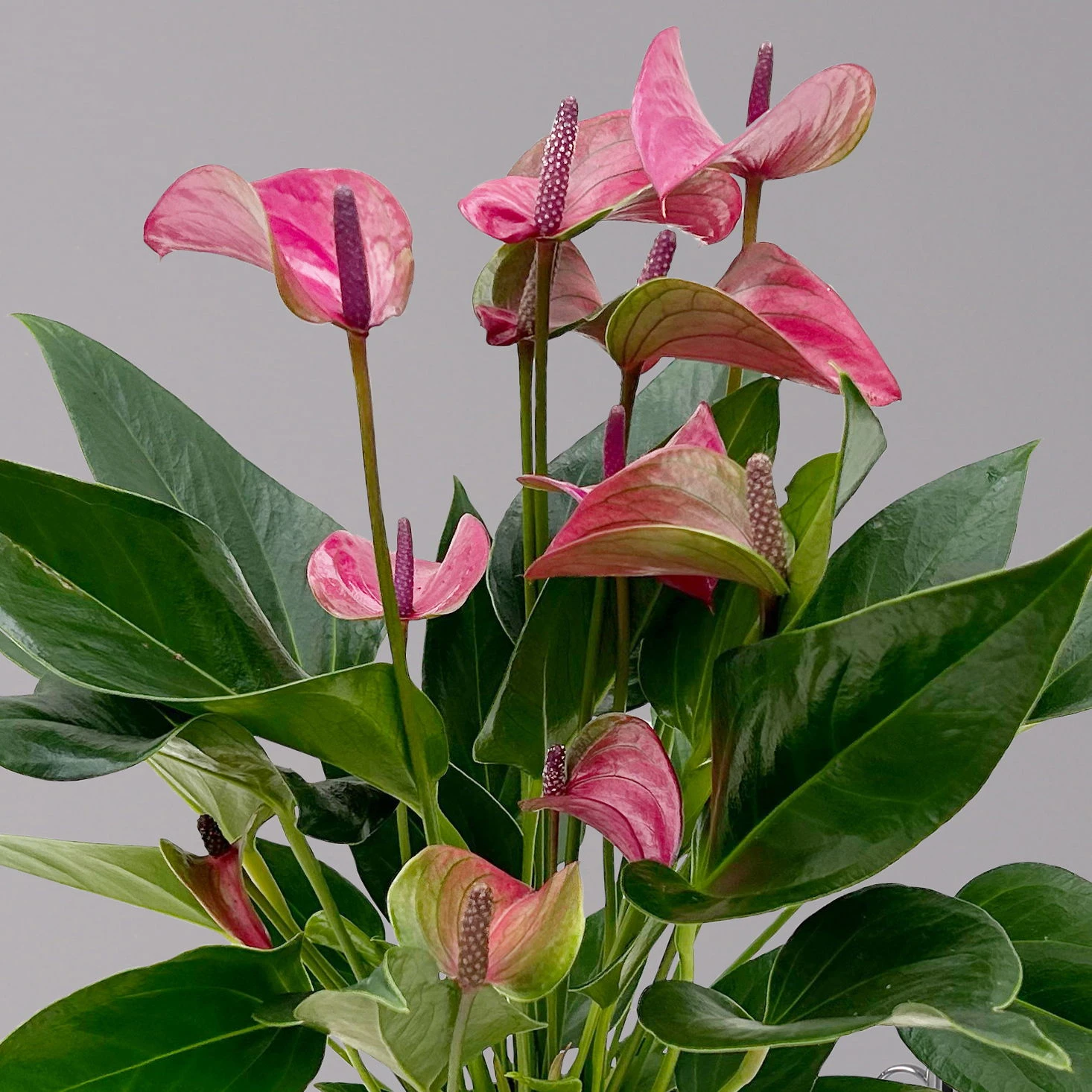 Die besonderen Hochblätter der Flamingoblume (Spatha) werden oft fälschlicherweise für die Blüten der Pflanze gehalten. Wie bei den meisten Pflanzen der Familie der Aronstabgewächse sitzt die eigentliche, kolbenartige, lilafarbene Blüte in der Mitte der Hochblätter und ist eher unscheinbar. Das leuchtend pinke Hochblatt, das an der Basis grünlich gefärbt ist, ist der Hauptblickfang und bringt Farbe in Ihr Zuhause. Die Flamingoblume treibt das ganze Jahr hindurch immer wieder neue Blüten aus, die bis zu 3 Monate am Stück stehen.