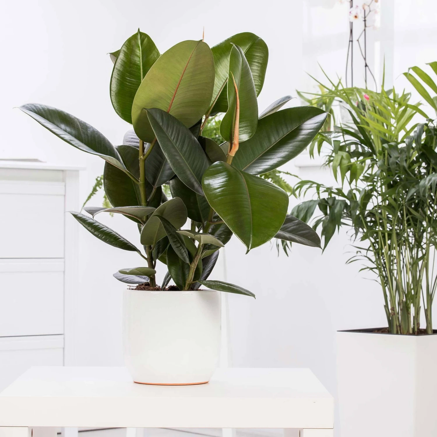 Für Hobbygärtner und Pflanzenfreunde, egal ob mit oder ohne grünen Daumen, ist der Gummibaum, Ficus elastica ‚Robusta‘ die ideale Zimmerpflanze. Die moderne Grünpflanze ist aufgrund ihrer leichten Pflege überaus beliebt und eignet sich daher hervorragend als Zierpflanze für Wohnungen, Geschäftsräume und Treppenhäuser. Dank der großen und tiefgrünen, glänzenden Blätter ist der Gummibaum ein angesagtes Wohnaccessoire, das in keinem Haushalt fehlen darf. Bei Pflanzen-Kölle können Sie den Gummibaum kaufen und an einem hellen und halbschattigen Plätzchen aufstellen. Damit die Blätter des Ficus elastica robusta eine kräftige Färbung annehmen und besonders gut gedeihen, dürfen Sie den Gummibaum auch für ein paar Stunden ins direkte Sonnenlicht stellen. Achten Sie bei der Pflanzenpflege des Gummibaumes zusätzlich auf einen feuchten aber nicht zu nassen Boden, da bei zu viel Wasser die Blätter abfallen können. Der Ficus elastica ‚Robusta‘ ist ein Klassiker unter den Zierpflanzen und heutzutage beliebter denn je.