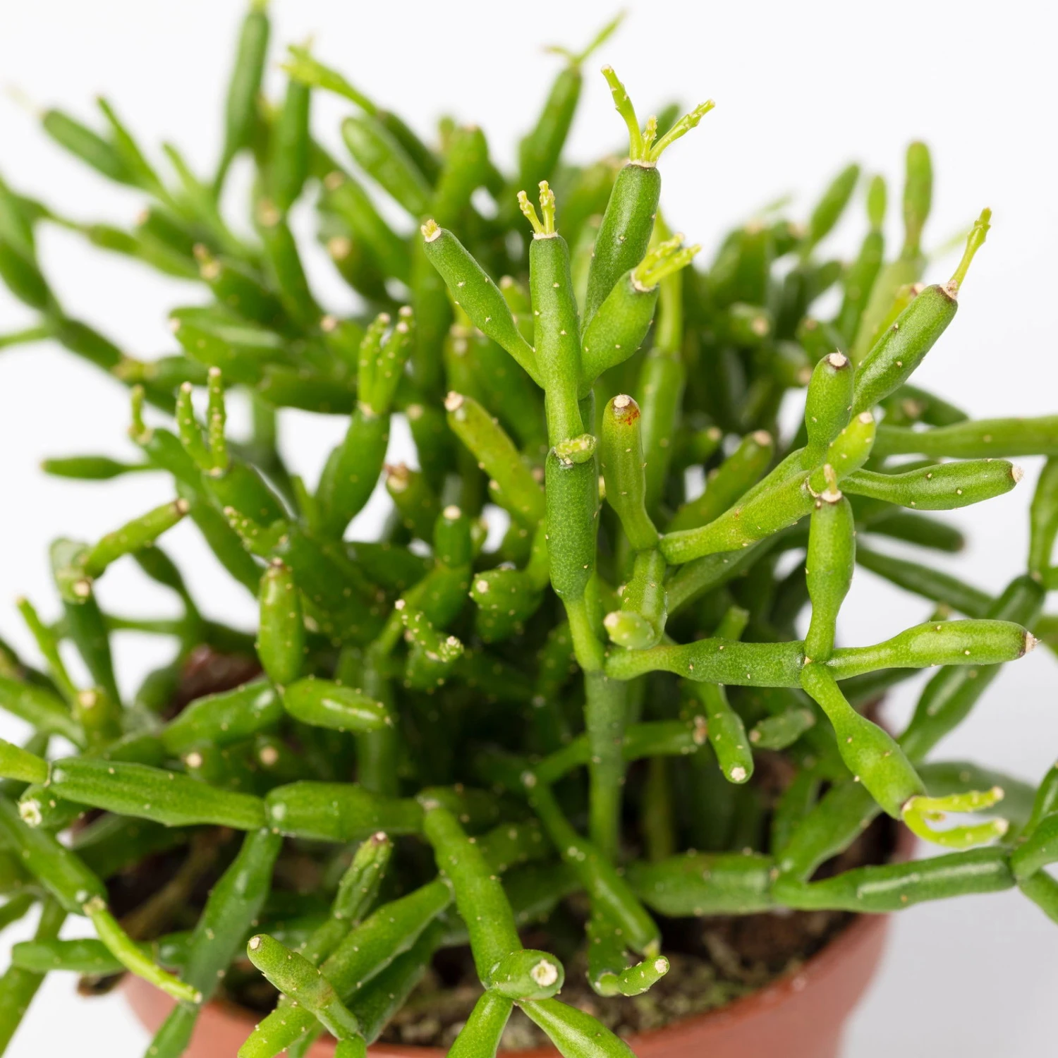 Falls Sie nach einer exotischen Begrünung für Ihr Zuhause suchen, dann bietet sich unser Mini-Korallenkaktus-Set (Rhipsalis) in formschönen Dekotöpfen mit dem abstrakten Wuchs geradezu an. Diese kaktusartigen Zimmerpflanzen sind ausgesprochen pflegeleicht und zeigen eine hohe Toleranz in Hinblick auf die Wassergaben. Lassen Sie das Substrat gründlich antrocknen, bevor Sie den Korallenkaktus wieder gießen. Eine gute Drainage ist für die Pflanzengesundheit entscheidend, daher eignet sich Kakteenerde für die Pflege der Pflanzen am besten. Die Pflanzen brauchen das ganze Jahr über konstante Wärme, sodass die Raumtemperaturen nicht unter 20 Grad Celsius fallen dürfen. In der kalten Jahreszeit sollte zusätzlich auf einen Standort abseits von trockener Heizungsluft geachtet werden.
